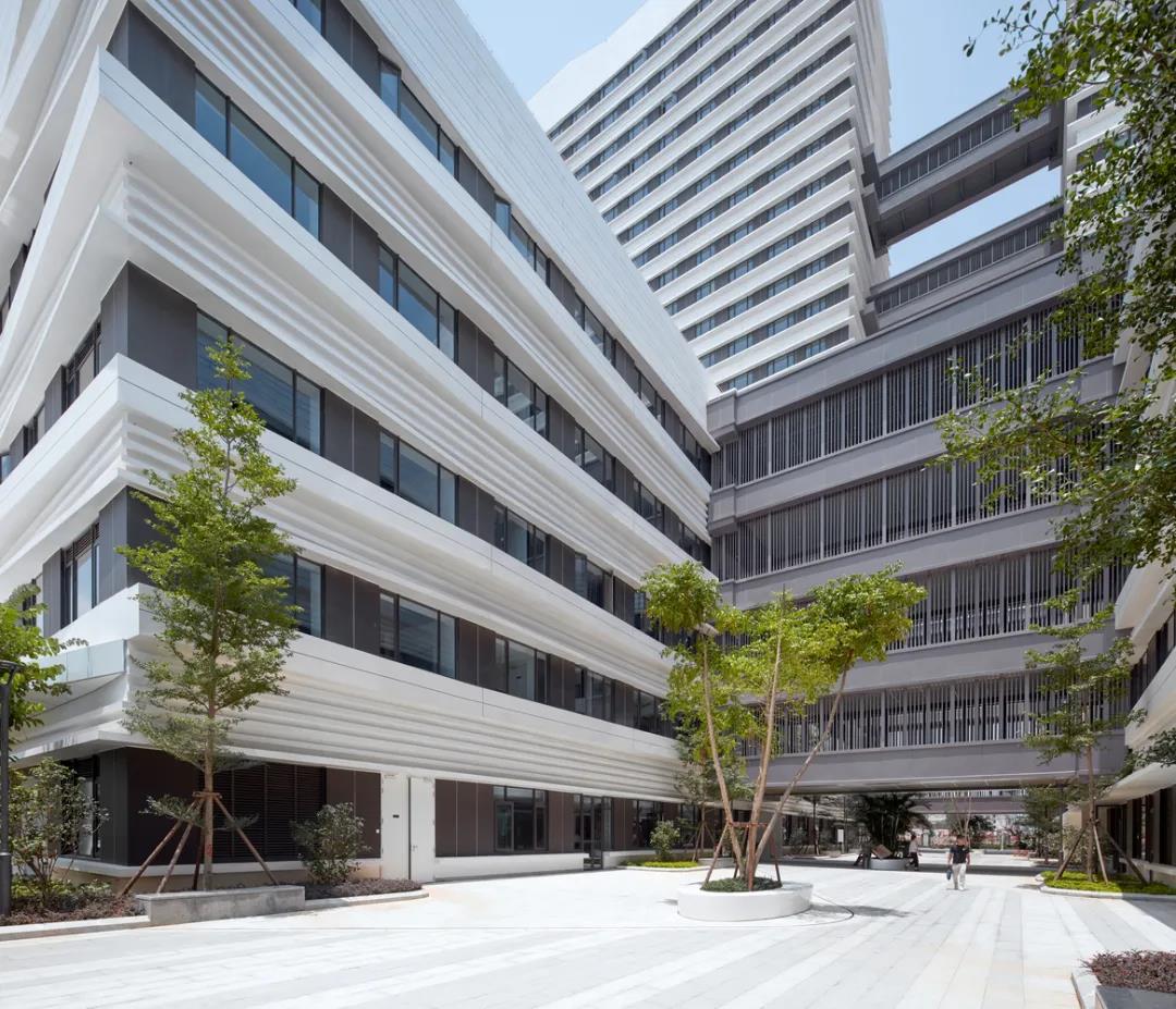 在模塊化排布和重建的基礎上,建筑的外立面將30多萬平方米的建筑以水平折線的幾何連接在一起,從而形成一個具有節奏感的整體外部體驗。陽光和陰影被建筑立面的紋理所分割,使得使用者可以更關注建筑的細節以及建筑物與自身之間的關系,這種設計表明這是一個可以提供細致服務的醫療空間。