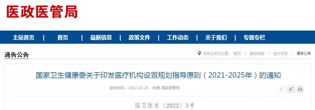 1月30日,國家衛生健康委印發《醫療機構設置規劃指導原則(2021—2025年)》。《規劃》明確,醫療機構的設置以醫療服務需求、醫療服務能力、千人口床位數(千人口中醫床位數)、千人口醫師數(千人口中醫師數)和千人口護士數等主要指標進行宏觀調控,具體指標值由各省、自治區、直轄市根據實際情況確定。其中,2025年全國醫療機構設置規劃主要指標中,2025年千人口床位數的指導性要求為7.4~7.5床;每千人口執業(助理)醫師數(人)3.2人;二級及以上綜合醫院設置老年醫學科的比例不低于60%;縣辦綜合醫院適宜床位規模600~1000張;市辦綜合醫院適宜床位規模1000~1500張;省辦及以上綜合醫院適宜床位規模1500~3000張。