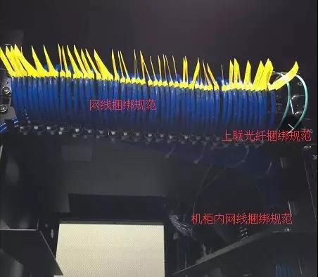 內網接入交換機布放的線纜通過理線器整理,在理線器上每4根網線用扎帶做捆綁,每一根網線上標有唯一的一個標簽,另一端放到機架內托盤位置。光纖下放長度無須太長,彎曲度不能太大,貼好標簽且上聯到不同核心的光纖應盡量用不同顏色的標簽來區分。